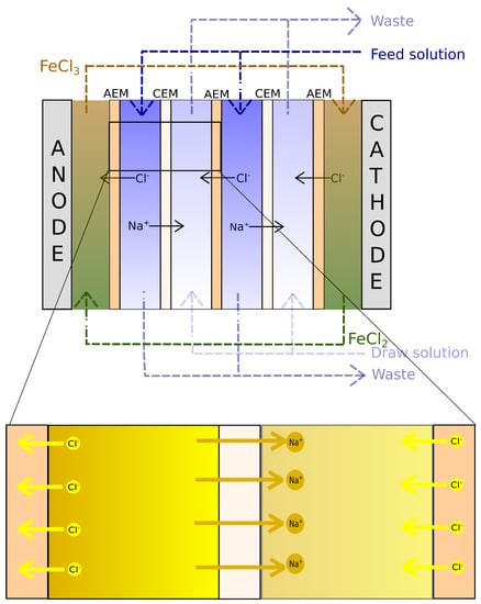 Illustration of ion distribution in the concentrated and dilute streams of a RED stack consisting of AEMs, CEMs, and concentrated and dilute solution channels. FeCl and FeCl are the electrode rinse solutions [18].
