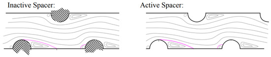 Illustration of active and inactive spacer-filled channels with developed wakes in reattachment region. Inactive spacers (left side) suppress local ion migration through the membrane, while active spacers (right side) are permeable.