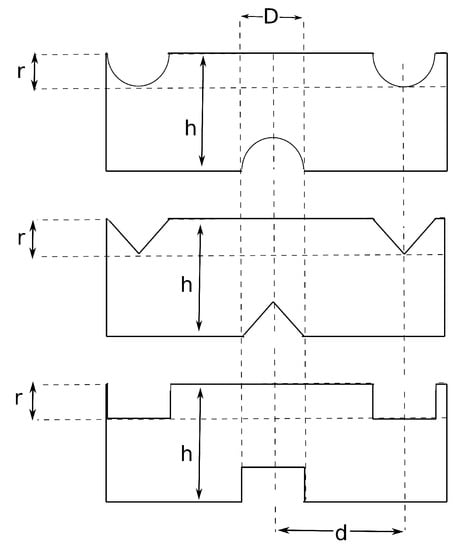 Schematic of the different corrugations (cylindrical, triangular and square) with characteristic parameters.