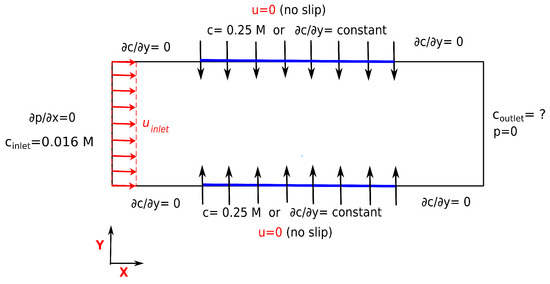 Illustration of boundary conditions in a flat channel. Zero flux conditions are applied for sections up- and downstream of the active membrane (blue horizontal line) to mitigate the influence of the in- and outlet. Active membrane regions have either a constant concentration equal to 250 or an equivalent flux.