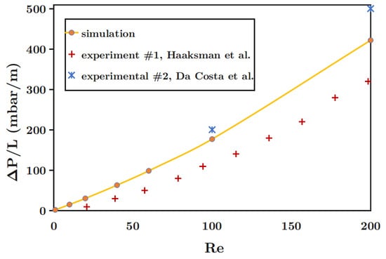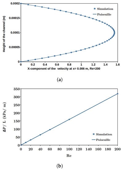 The objective of this section is to verify the velocity and pressure drop as obtained from simulations with Poiseuille flow for an incompressible fluid, steady-state and laminar flow through a flat channel [58]. Figure 6 shows the comparison of velocity profile and pressure drop as a function of channel height and Reynolds number, respectively, showing excellent agreement.