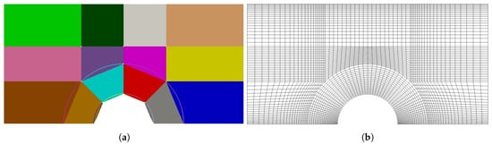 (a) Configurations of 14 blocks of a single cylindrical corrugation; and (b) local mesh refinement around the cylindrical corrugated wall (coarse mesh).