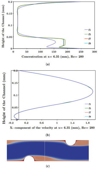 Concentration and velocity profiles along the height of the channel: (a) concentration profile with respect to the height of the channel at Re = 200, X = 6.35 mm for four different levels of mesh refinement; (b) X-component of velocity profile with respect to the height of the channel at Re =200 and X = 6.35 mm for four different levels of mesh refinement; and (c) position of investigated location (X = 6.35 mm) in cylindrical corrugated channel.