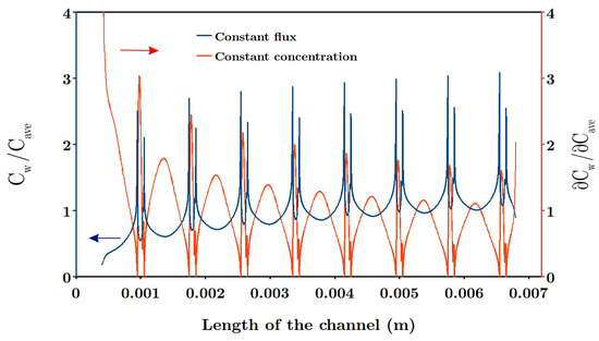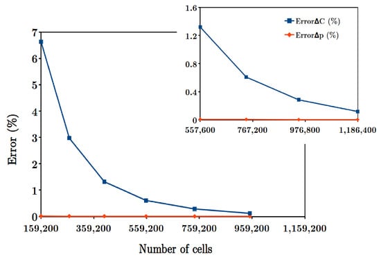 where mass transfer is defined as based on the mass average on the inlet and outlet surfaces. and are concentration differences between the inlet and outlet of the channels at successive stages of grid refinement. Similar to concentration, and are pressure losses between the inlet and outlet of the channels at successive stages of grid refinement. As grid becomes finer (i.e., i is increasing), the error decreases. The numerical simulation errors for concentration difference and pressure loss are shown in Figure 9 as a function of the number of cells.