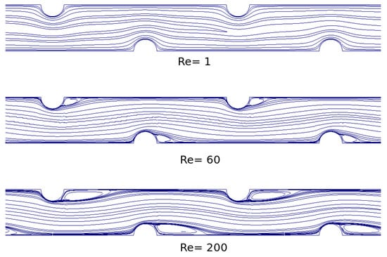 The velocity streamlines are presented for a cylindrical spacer-filled channel in Figure 11, when the Re number is equal to 1, 60 and 200.