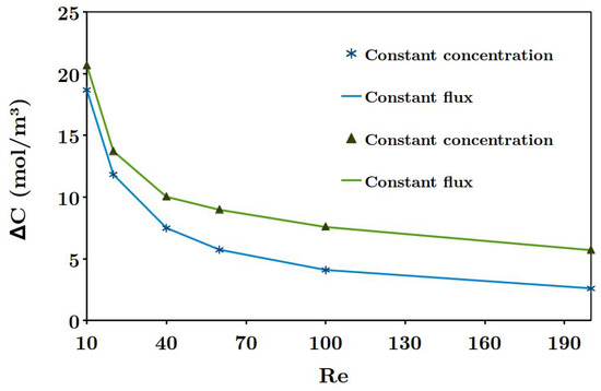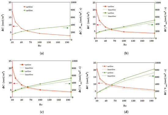 The residence time demonstrates the time that the dilute solution needs to pass through the whole length of the channel and mixes with the concentrated solution. Three observations can be extracted from the results in Figure 12. First, mass transfer (concentration difference) is decreasing as Re number is increasing by varying velocity for all studied geometries, both for active and inactive spacers. In fact, the mixing process during reverse electrodialysis is controlled both by diffusion and advection mechanisms; however, the diffusion mechanism is more dominant and important for all corrugations presented in this paper, where the height of the corrugations is relatively small compared to the height of the channel. As the Re number increases, decreases for channels with similar total length, the diffusion mechanism becomes less significant compared to advection mechanism and the solution has less time for mixing. An analysis of normalized concentration differences with respect to residence time allows estimating the size of the mass transfer rate. Figure 12 shows that the normalized concentration difference with respect to residence time (mass transfer rate) increases as Re number increases. Second, the mass transfer (both concentration difference and normalized concentration difference with respect to residence time) is higher for an active spacer compared to inactive spacer as it is shown in Figure 12 for all types of corrugations. Since the mass can be transported through the active corrugations and inactive spacers can not transport mass (i.e., inactive spacers have no flux boundary condition), it is logical to expect that active spacers have higher mass transfer ability compared to the flat channel or channels with inactive spacers. It is important to note that the pressure gradient will not change from switching between active and inactive spacers.