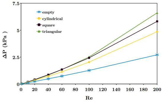 Comparison of pressure difference between inlet and outlet of the channel as a function of Re number for all studied geometries at C.