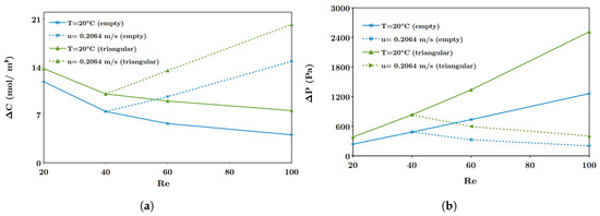 Introducing corrugations affects both the concentration difference () and pressure drop (), between inlet and outlet of the channel. Comparisons of concentration difference and pressure loss for different geometries at different Reynolds numbers can provide criteria to select optimum geometries with minimum pressure drop and maximum mass transfer efficiency. As discussed in the Section 1, the membrane area is a key parameter for the mass transfer. Figure 12 compares the concentration difference and normalized concentration difference with respect to residence time as a function of Re for both active and inactive spacers with different geometries, while Figure 13 shows the corresponding pressure loss. Table A1 in Appendix A summarizes , and mass transfer rate for flat channel and for all types of active spacer-filled channels at different Re numbers and residence times. The residence time of the feed solution in the channel is defined as the ratio of the linear length of the channel divided by the average velocity given by Equation (18).