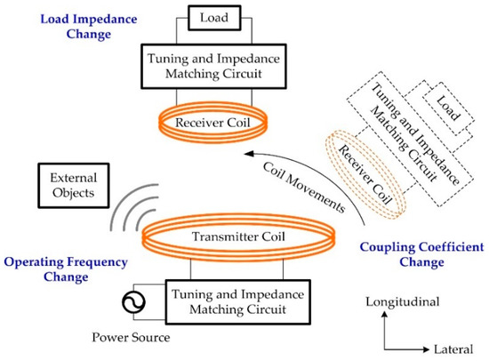In recent years, wireless power transfer (WPT) for moving objects using coupled magnetic resonance (CMR) has become a hot research topic, such as WPT for portable electronic devices and moving electric vehicles [1,2,3]. Unlike WPT systems for stationary objects, there are many uncertain parameters in the WPT systems for moving objects. For example, because users prefer to move the receiver freely, the distance between the transmitter and receiver coils is uncertain [4,5]. In addition, the magnetic field of the dynamic charging system is prone to interact with the objects around it, such as metal materials, and electromagnetic devices, etc. These external uncertain factors will change the impedance parameters of the circuit and make the resonance frequency of the system uncertain [6,7]. Moreover, the load impedance of the WPT system will be influenced by many uncertain factors, including environmental change, and load switching, etc. [8,9,10] The load impedance variations will also bring uncertainty to the WPT system.