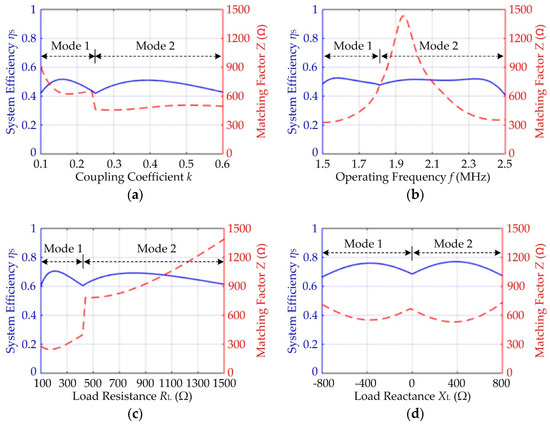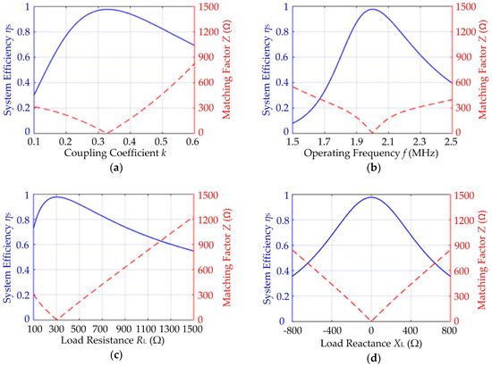 Figure 7 shows the calculated system efficiencies (blue solid line) and matching factors (red dashed line) of the modified WPT system using the tradeoff solutions. It can be observed that the system efficiency of the modified WPT system only changes slightly when the coupling coefficient, the operating frequency, the load resistance or the load reactance varies over a wide range. It can be seen from Figure 7a–d that the average system efficiencies are 0.467, 0.484, 0.654, and 0.717, respectively. Therefore, the modified WPT system only achieves medium system efficiency.