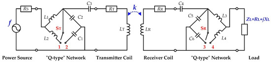 The Q-type impedance matching network at the transmitter-side includes two compensation inductors () and three compensation capacitors (). Similarly, the Q-type impedance matching network at the receiver-side includes two compensation inductors () and three compensation capacitors (). There are two single pole double throw switches ( and ) in the Q-type impedance matching networks. As shown in Figure 4, can switch between point 1 and point 2, and can switch between point 3 and point 4.