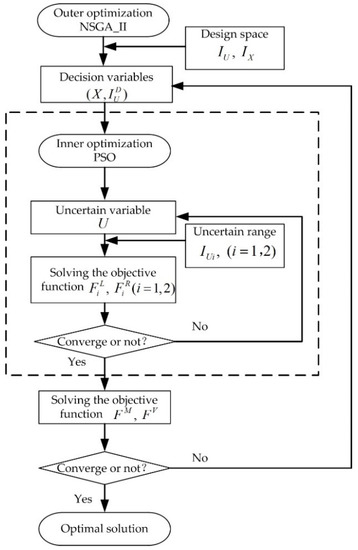 Equation (21) is a bi-level nested optimization problem, in which the inner optimization is to find the variation bounds of the system efficiency when the uncertain parameters vary, and the outer optimization is to find the optimal solutions for the modified WPT system. However, because there is a nested optimization process, it is difficult to find the optimal solution using traditional gradient-based optimization algorithms. In this paper, the particle swarm optimization (PSO) algorithm [33] is used to solve the inner optimization problem, and the nondominated sorting genetic algorithm-II (NSGA-II) [34] is used to solve the outer optimization problem. The proposed optimization process is shown in Figure 5.