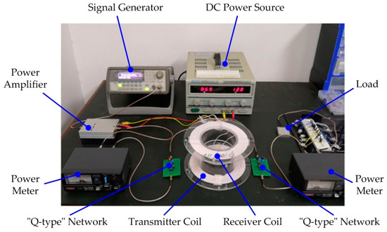 A power amplifier was used to input power to the transmitter coil. The operating frequency of the power amplifier could be adjusted from 1.5 to 2.5 MHz (Such a frequency range was chosen because the power processing circuits with this operating frequency range is commercially available and easy to implement [26]). The output resistance of the power amplifier was 50 Ω. A load was used to consume the power received by the receiver coil. The load resistance could be adjusted from 50 Ω to 1050 Ω, and the load reactance could be adjusted from −300 Ω to 300 Ω.