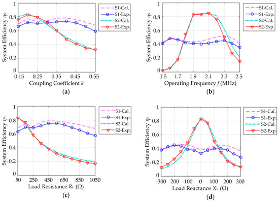 When the coupling coefficient , the operating frequency , the load resistance or the load reactance varies, the system efficiencies of the two kinds of WPT systems are shown in Figure 10a–d, respectively. The purple dashed lines (S1-Cal.) and blue solid lines (S1-Exp.) represent the calculated and measured system efficiencies of the modified WPT system respectively. The green dotted lines (S2-Cal.) and red solid lines (S2-Exp.) represent the calculated and measured system efficiencies of the SS compensated WPT system respectively.
