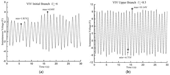For Ur = 12.25, it was observed that the minimum of the positive displacement was 1.17 mm, the maximum was 33.50 mm, and the difference between the maximum and minimum was 4.04A (A = 8 mm). The oscillation amplitude fluctuation was large and the performance was very unstable, as shown in Figure 12c, demonstrating that the prism underwent the VIV lower branch.
