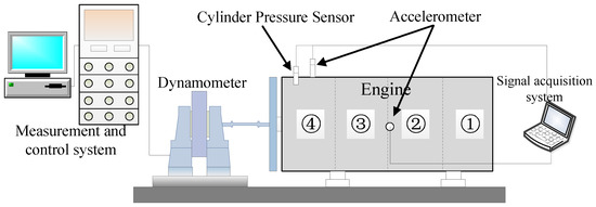 In this study, the research object is the engine vibration, which is the main source of vibrations for entire vehicle. The main moving parts of the engine are the piston assembly, connecting rods, and crankshaft. Vibration in a reciprocating piston engine is mainly caused by the changes in gas pressure in the cylinder and the alternating inertia force on the different parts. Two accelerometers are used to obtain the vibration signal of the engine. One accelerometer is installed on the engine head to measure the vibration along the direction of piston motion, and another one is installed on the engine block between the second and the third cylinders in the vertical piston movement direction, as shown in Figure 1. The TDC pulse signal is measured by the Hall sensor and the crankshaft rotation angle was recorded accordingly. The Hall sensor is connected to the front of the crankshaft. Vibration signals and TDC pulse signal are recorded by signal acquisition instrument, and transmitted to the computer through the universal serial bus (USB) port. The schematic diagram of the test engine is shown in Figure 1.