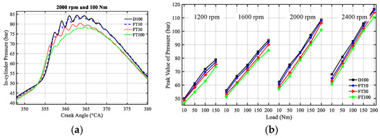 (a) the combustion pressure curves of all fuel under the condition of 2000 rpm and 100 Nm. (b) the pressure peak value of all fuels under all test conditions.