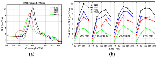 (a) PRR curves of all fuels under the condition of 2000 rpm and 100 Nm. (b) PRR peak value of all fuels under all test conditions.
