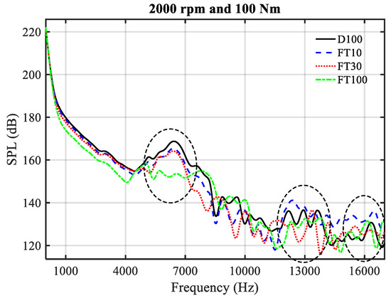 Combustion pressure in cylinder has typical acoustic characteristics which involves abundant time-domain and frequency-domain information. For a better understanding of vibration feature related with combustion, the spectrum of the in-cylinder pressure would be analyzed. Subsequently, the sound pressure level (SPL) spectrum of the cylinder pressure signal is calculated, and the reference sound pressure is selected as 20 μPa. Figure 4 illustrates the comparison of the combustion pressure spectrum when using different fuels at 2000 rpm and 100 Nm. In the low frequency band of less than 500 Hz, the amplitude decreases rapidly, which reflects the frequency characteristics of the smooth curve of gas combustion pressure in the cylinder. The higher the peak pressure values in the cylinder, the greater the amplitude of the low frequency component becomes. In the middle frequency band of 500–4000 Hz, the decreasing trend becomes slow, the amplitude decreases gradually with the increase in the proportion of CFT, and the difference between each fuel is more obvious than in the low frequency band. This frequency band reflects the peak PRR value of the gas in the chamber. The higher the peak PRR value, the greater the energy in the middle frequency band becomes, as shown in Figure 3a. In the high-frequency band above 4 kHz, the amplitude oscillation becomes strong, and the energy concentration phenomenon occurs approximately at the frequencies of 4–7, 13 and 16 kHz. The high-frequency components result from the cylinder pressure oscillation in the cylinder, which also reflects the maximum acceleration of combustion pressure change.