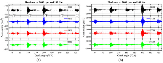 Figure 5a,b show the time-domain vibration signals collected from the engine head and block, respectively, during one complete working cycle at the speed of 2000 rpm and load of 10 Nm. In the two figures, the vibration of each cylinder has been shown according to the firing order. The amplitude of the vibration signal in the fourth cylinder is the maximum compared with the other three cylinders0 because the acceleration sensor is located close to the fourth cylinder. The firing order of the test engine is 1-3-4-2-1, and combined with the valve timing angle, the sequence of events in Figure 5a from left to right is that TDC of the first cylinder, exhaust valve closing (EVC) of the fourth cylinder, TDC of the third cylinder, inlet valve closing (IVC) of the fourth cylinder, TDC of the fourth cylinder, EVC of the fourth cylinder, and TDC of the first cylinder. In practice, the vibration characteristic of these events can be altered when a failure occurs at a certain position, and this failure can be identified by detecting the change in the phase and intensity arising of abnormal vibration signal from the failure. Compared with petro-diesel, the influence of the different combustion characteristics of alternative fuel used in CI engine on the vibration signal has a similar effect.