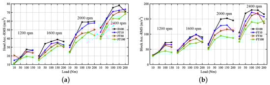 In order to intuitively compare the effects of blended fuel used in the engine on vibration characteristic, RMS values of engine head and block vibration signals are shown in Figure 6a,b, respectively, which summarize the average RMS values of vibration acceleration signals for all blended fuels in the mentioned operation condition. RMS value is the root mean square of the signal and is used to represent the energy in the signal. It can be clearly seen from the two figures that the change of the RMS value of the four fuels is almost the same under all operation conditions.