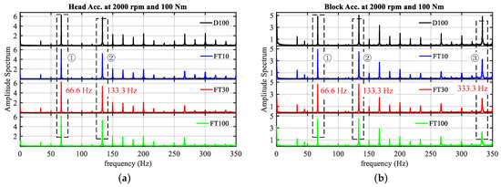 The frequency characteristic of the engine vibration signal is important for the NVH performance of the vehicle, passengers, and drivers. CI engine is rotary power machinery, and the rotation of the parts supplies a certain excitation which generates an amplitude response in the engine structure during normal operation. During a complete working cycle (720°), the crankshaft rotates two revolutions for the test engine. In each revolution (360°), combustion events happen twice, and intake and exhaust valve seating events happen once in each cylinder for the engine. For example, when the engine speed is 2000 rpm, the rotational frequency is 33.3 Hz, the frequency of combustion events is 66.6 Hz (2000/60/2 × 4 = 66.6 Hz), the frequency of valve seating events is 133.3 Hz (2000/60/2 × 8 = 133.3 Hz), as shown in Figure 7a,b. The amplitude at the two characteristic frequencies (66.6 and 133.3 Hz) is the largest, indicating that combustion shock and valve seating impact are the two main excitation sources for the engine head.