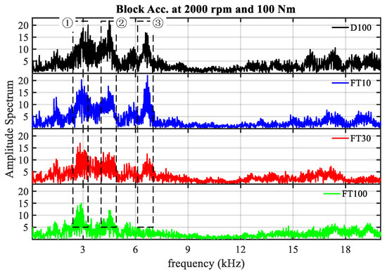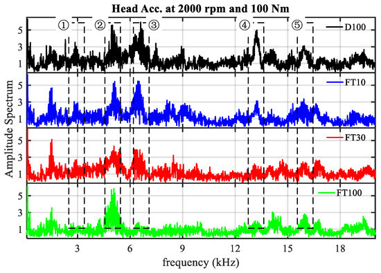 In order to study the influence of CFT and CFT blends on the vibration characteristics of CI engine, the amplitude spectrum curve of the engine head vibration signal at a rotational speed of 2000 rpm and load of 100 Nm as shown in Figure 5a is obtained by the fast Fourier transformation (FFT). The transformation results are in Figure 8. The frequency band of vibration acceleration of the engine head is relatively wide. There are high amplitudes in the frequency range of 1~9 kHz and approximately 13 and 16 kHz. Combined with the SPL spectrum of the combustion pressure curve in Figure 4, it is found from Figure 8 that there are four frequency components in the highlighted response area: 5, 6.48, 13.2 and 16 kHz, which are the dynamic response frequencies of engine head induced by combustion.