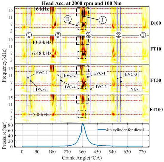 In order to facilitate the identification and analysis of the time at which a particular frequency event occurs, a continuous wavelet transformation (CWT) is applied to the raw acceleration signal of the engine head (as shown in Figure 5a) is shown in 2D in Figure 9. The mother wavelet used by the transformation is the Morlet, and the critical contents are clearly highlighted by the CWT analysis. For the subsequent analysis, valve-close timing information is also indicated because, compared with exhaust valve opening (EVO) and inlet valve opening (IVO), the dominant response is still caused by the combined IVC and EVC [32]. At 360 °CA, the prominent response energy areas are in frequencies of 5, 6.48, 13.2, and 16 kHz. These four frequencies are the excitation responses of the combustion and pressure oscillation from the time-frequency distribution. The response energy area at the frequency content of 5 kHz remains basically unchanged for all fuels, but the response energy areas of the other three frequency contents are weaken with the increase in CFT proportion. The principal frequency content induced by the combustion pressure impact is approximately 5 kHz; meanwhile, the high-frequency response energy is significantly reduced, especially around 6.48 kHz, when blended fuels are burned.