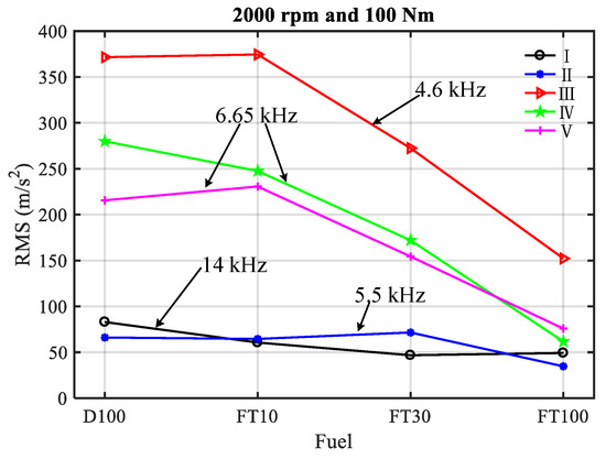 It can be perceived that the response energy of each area attends to decrease with the increase of CFT proportion, overall. But the RMS-I of FT30 is significantly less than the value of II. This means that the vibration response of FT30 is greater around 5.5 kHz, while the vibration response around 14 kHz is smaller. Compared with FT100, the combustion of FT30 is more powerful due to the higher heating value. Moreover, the combustion of FT30 presents only moderate concerns regarding the atomization [30] because CFT is more volatile relative to D100. So, FT30 generates fewer high-frequency contents. In addition, the RMS of FT10 is maximum for V. It may be that the addition of a small proportion of CFT has less impact on the cylinder pressure. However, it may weaken the attenuation effect on the side thrust of the piston by diluting the oil film due to its low viscosity [33]. Thus, the accelerometer could receive more excitation energy induced by the piston side thrust force. For other blended fuels, RMS-V values decrease with the increase in CFT proportion such that the effect of cylinder pressure reduction on the side thrust is more significant.