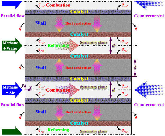 Detailed modeling is necessary to understand the interaction between kinetics and transport in reactor performance because of the small scale of the microchannel reactors involved [43,44,45,46]. The system presented in this paper is methane steam reforming coupled with catalytic combustion in thermally integrated microchannel reactors for the production of hydrogen. The catalytic combustion provides the energy required to achieve the rapid production of hydrogen on the opposite side of the dividing plate. A schematic diagram of the reactor used is given in Figure 1, where the horizontal arrows represent the direction of the flow. The two flow arrangements modeled in this paper are also given in Figure 1. In such a heat exchange design, efficient heat exchange within the small-scale system is possible [47,48,49]. Recent studies have demonstrated that the management of energy in a small-scale confined space is one of the great challenges in design [50,51]. Accordingly, the thermal interaction between reforming and combustion is investigated for the purpose of the rapid production of hydrogen.