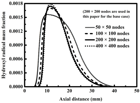 Figure 2 shows the profiles of the hydroxyl radical concentration along the combustion channel centerline for the meshes indicated for the base case. Refer to Table 1 for the operating conditions used in the numerical simulations performed here. As the mesh density increases, a trend toward convergence can be found for the solution. The coarsest mesh, totaling 2500 nodes, cannot accurately describe the concentration of the hydroxyl radical appearing in the reaction region and its peak position. Therefore, the coarsest mesh fails to accurately describe the chemical reaction occurring in the combustion channel. In contrast, the solution obtained from a mesh consisting of tens of thousands of nodes used for the base case can be considered to be reasonably accurate. A larger mesh density, up to 160,000 nodes in total, offers no significant advantage.