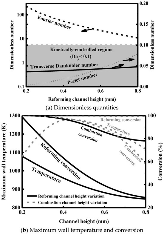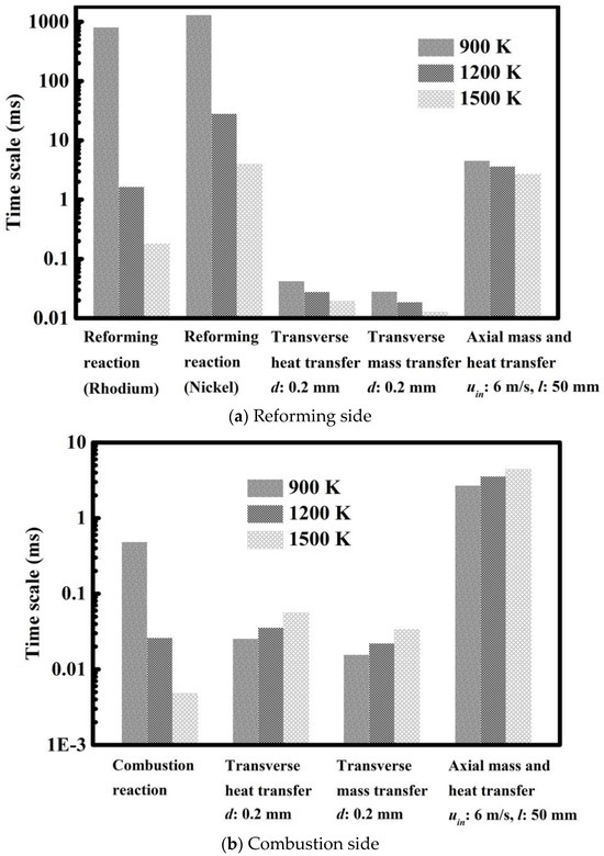Typical mass and heat transfer and intrinsic reaction time scales are shown in Figure 4b for the combustion channel. The temperature can also significantly affect the time scale of the intrinsic combustion reaction, ranging from about 0.005 to 0.5 milliseconds. The time scale is far smaller than that of the intrinsic reforming reaction, and the difference between the two time scales becomes more pronounced when the temperature is low. On the combustion side, the difference in the time scale between the transverse transfer and the intrinsic reaction is relatively small, which is opposite to the difference obtained on the reforming side. This suggests that the combustion reaction is limited by both transport and kinetics, and it is therefore necessary to further intensify the process by reducing the dimension. The effect through the improvement of the catalyst in the activity or loading is not significant. The residence time is much higher than the other time scales, and thus complete conversion can be easily achieved for the combustion process.