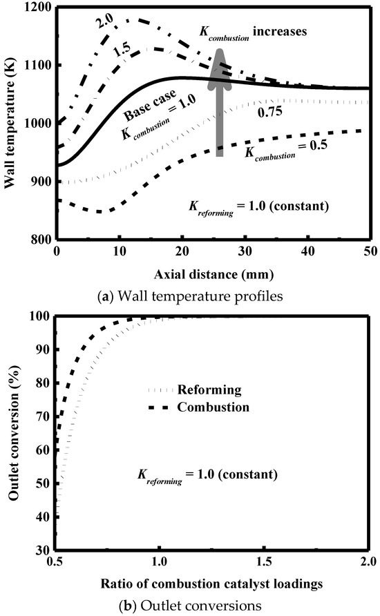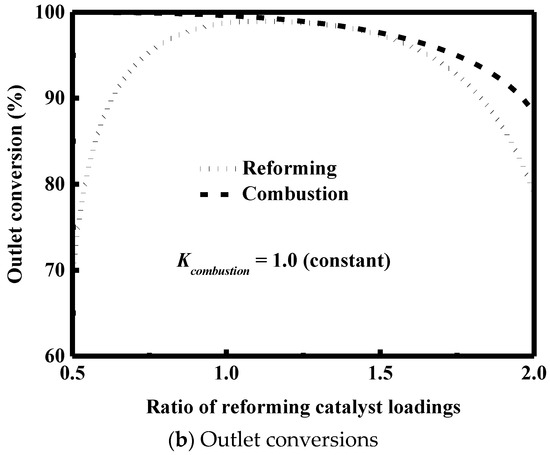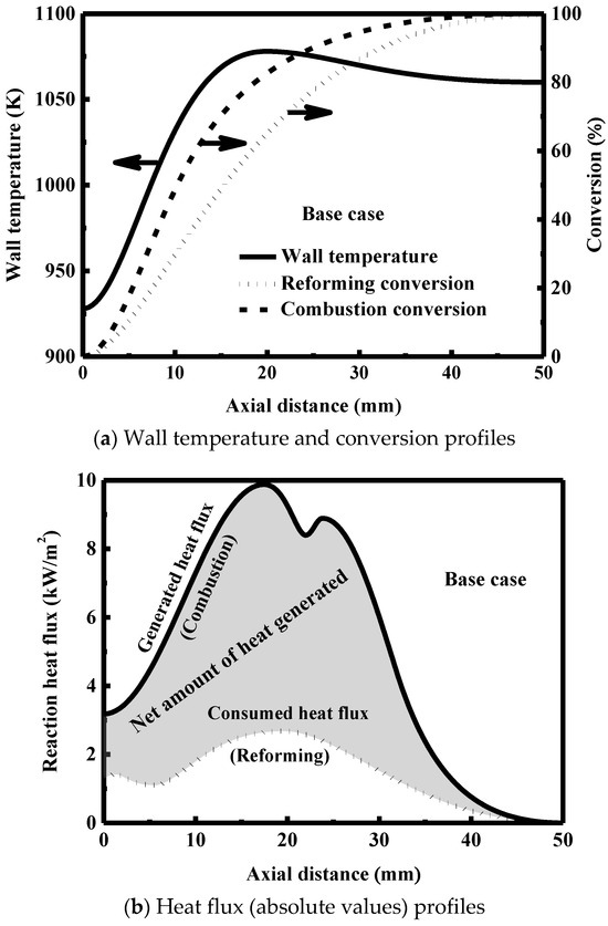 Because the management of energy in a small-scale confined space is very important for reactor design [51,87], the effect of the thermal coupling within the reaction system is investigated. Figure 5a shows the temperature and conversion profiles along the axial direction (i.e., along the length of the reactor). Hereafter, only rhodium is used as the catalyst employed on the reforming side; in addition, where appropriate, the reforming reaction chamber and the combustion reaction chamber will be referred to as “reformer” and “combustor”, respectively.