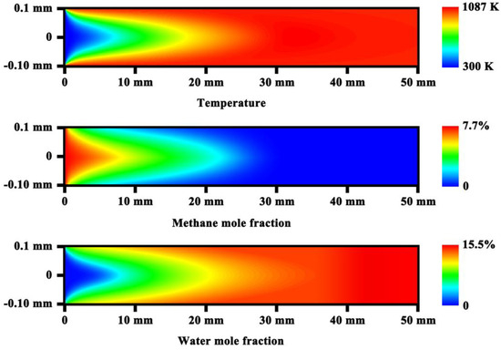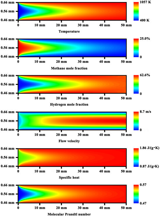 Figure 6 shows the contour plots of the temperature, species concentration, flow velocity, specific heat, and molecular Prandtl number on the reforming side for the base case. The Prandtl number can be used to determine the thermal conductivity of gases at high temperatures [88]. Because the molecular Prandtl number is small, the heat diffuses quickly in comparison with the flow velocity. While the wall temperature difference is negligible in the transverse direction, there are steep species and temperature gradients in the gas phase near the reaction region, as shown in Figure 6. In this context, a two-dimensional numerical model is required, because each of the heat and mass transfer may be important in the axial direction.