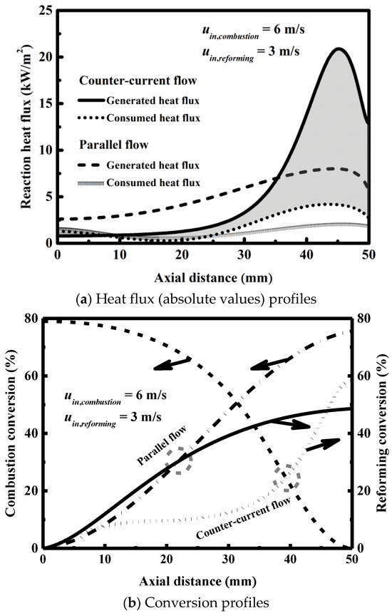 Figure 8b shows the conversion profiles for the two flow arrangements examined in this paper. At the outlet of the combustor, a higher conversion can be achieved for the countercurrent flow exchange system (79.0%) than for the parallel flow exchange system (75.6%). On the combustion side, most of the fuel is converted near the reformer outlet for the countercurrent flow exchange system; in this context, the heat released by the catalytic combustion is more concentrated near the reformer outlet. For the countercurrent flow exchange system, the gradual disappearance of the reactants along their flow direction can decrease the rate of the reaction occurring on the combustion side and subsequently the capability of the gas mixture on the reforming side to consume the heat released by the catalytic combustion. Therefore, a high imbalance of energy flow can be found within the countercurrent flow exchange system under the conditions examined here; in addition, the excess heat released by the catalytic combustion near the outlet of the reformer overheats the gas mixture on each side of the reactor, thus increasing the possibility of the reaction occurring in the gas phase on the combustion side. On the other hand, the conversion is higher on the reforming side for the parallel flow exchange system than for the countercurrent flow exchange system along the whole length of the reactor, except at the outlet of the reformer due to the increased temperature for the countercurrent flow exchange system.