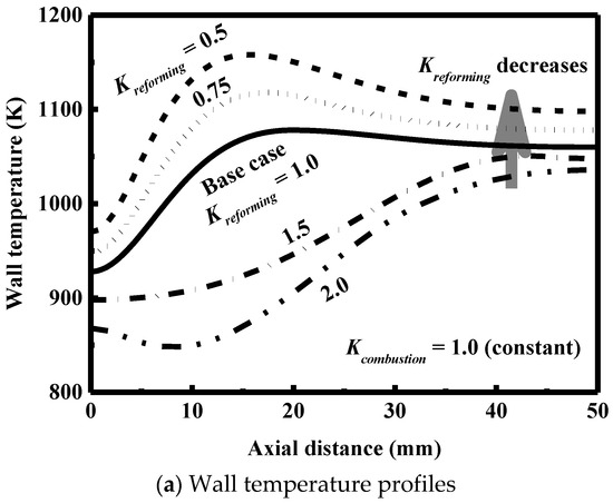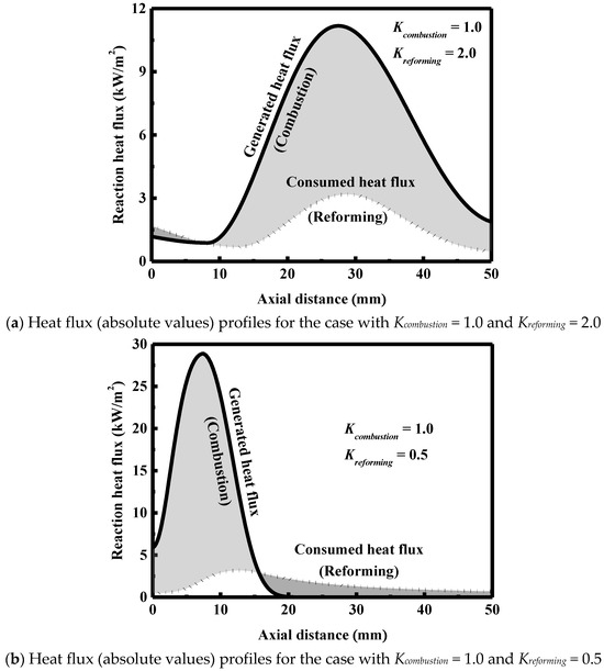 Figure 5a shows that the wall temperature first increases and then decreases very slowly along the axial direction. The outlet conversion is almost completed for the fuel on each side of the reactor, because the rate of each of the combustion and reforming reactions is very high under the conditions examined here. Figure 5b shows the absolute values of the consumed and generated heat fluxes, respectively, along the axial direction. The initiation of the gas-phase combustion is possible, as indicated by the sub-peak shown in the generated heat flux profile. The reaction occurring on the combustion side provides the heat energy required to heat up the gas mixtures on both sides of the reactor and to drive the reforming reaction simultaneously. The shaded region in Figure 5b represents the net amount of heat generated. The peaks shown in the generated and consumed heat flux profiles appear almost at the same axial position. The rate of the reaction on the combustion side much is much higher than that on the reforming side, thus increasing the temperature at the first half of the reactor, as shown in Figure 5a. In contrast, there is a small difference between the two heat fluxes at the second half of the reactor, and thus each of the wall and fluid temperatures is nearly uniform along the axial direction, as shown in Figure 5a.