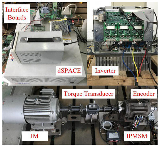 In this section, experimental results are presented to verify the theoretical analysis about the three influencing factors to prediction error of FCS-MPCC algorithm. Figure 2 shows the experimental setup utilized in this work. The plant is a 2-kW IPMSM system (Weiheng Technology, Hangzhou, China) whose key parameters are listed in Table 1. The load is an induction motor (IM), which can be controlled in both speed mode and torque mode. The power circuit includes a two-level, three-phase VSI with a DC-link voltage of 300 V. A dSPACE1005 platform (dSPACE GmbH, Paderborn, Germany) is employed for the execution of FCS-MPCC algorithm.