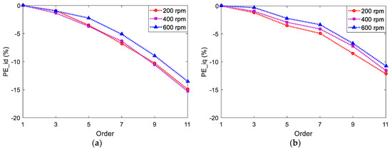 According to Equations (13) and (14), the Taylor series expansion is truncated by different discretization orders to obtain prediction models, i.e., N = 1, 3, 5, 7, 9, 11. The sampling time is 100 μs and the inductance values in prediction model are the same as that in Table 1. Different speed conditions—200, 400, and 600 rpm—are tested. As defined above, the corresponding RMS prediction errors under one-order discretization are chosen as PEbase, which are listed in Table 2 and are also the same as the ones in Section 4.2 and Section 4.3. The relative prediction errors of id and iq for different prediction models are shown in Figure 3. It is noticeable that both prediction errors of id and iq decrease with an increase in discretization orders, which holds true for different speeds. The results follow the theoretical analysis in Section 3.1. Under different speeds, the differences between RMS prediction errors of id or iq under one-order case and eleven-order case are less than 0.02 A, and the corresponding differences of relative prediction errors are less than 15%, which reveals the weak influence of discretization order on current prediction errors for this low-power setup. However, an increase in discretization order will make the algorithm more complex and lead to higher computation burden.