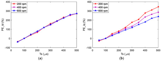 In this section, the prediction model is obtained by one-order Taylor series expansion, and the inductance values in prediction model are the same as that in Table 1. Different speed conditions—200, 400, and 600 rpm—are tested. Figure 4 shows the relative prediction errors of id and iq when different prediction stepsizes—control periods and sampling time—are adopted in FCS-MPCC algorithm, i.e., from 50 μs to 500 μs by the step of 50 μs. The RMS prediction errors under prediction stepsize of 100 μs are chosen as PEbase for different speeds, as shown in Table 2. As expected, longer prediction stepsize yields greater prediction errors for both id and iq. A quite large prediction stepsize can seriously deteriorate the control performance of motor system and even lead to instability, which has also been tested in experiments. By comparing the prediction errors in Figure 3 and Figure 4, it can be seen that the variation of prediction stepsize has a more obvious effect on the prediction error compared with that caused by varying discretization order; therefore, it is necessary to choose a suitable prediction stepsize.