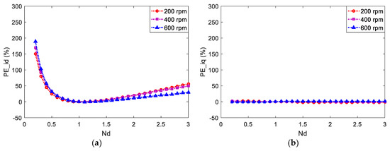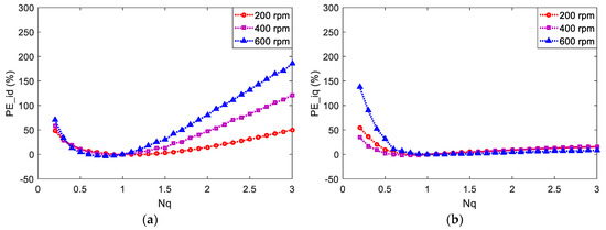 Similar experiments for the case of Lq mismatch are also conducted, and the relative prediction errors are presented in Figure 6. The same PEbase values as those in Figure 5 are chosen. The curves are all concave but the locations of minimum prediction errors of id and iq are different. For id, the minimum prediction errors are obtained when Nq is 1.1, 0.9, and 0.8 for 200, 400, and 600 rpm, respectively, and the corresponding values are −0.4%, −1%, and −2.4%. The minimum prediction errors of iq are obtained when Nq is 0.8, 0.8, and 1.1 for 200, 400, and 600 rpm, respectively, and the corresponding values are −0.8%, −1.8%, and −0.3%. From the perspective of minimum prediction error points, the prediction error curves of id are roughly symmetric, while those of iq are obviously asymmetric, which essentially follows the theoretical analysis and shows the stronger influence of negative deviation of Lq on prediction error of iq. From Figure 5 and Figure 6, the separate deviations of Ld and Lq can yield different effects on the prediction errors of id and iq with respect to the magnitude and its change rate.