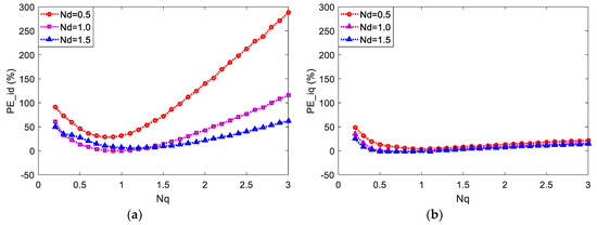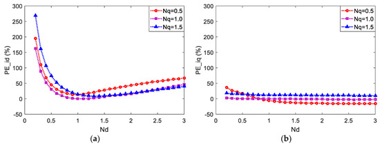 Additionally, the cases in which both Nd and Nq change are further tested under the speed of 400 rpm, and the corresponding PEbase values can be seen in Table 2. The relative prediction errors of id and iq are exhibited in Figure 7 and Figure 8. The variation trends of PE_id and PE_iq are similar to that shown in Figure 5 and Figure 6. It can be seen that the deviations of Ld, especially negative ones, can influence the prediction error of id more obviously and that such relationship also exists between the deviation of Lq and the prediction error of iq, which also follows the theoretical analysis.