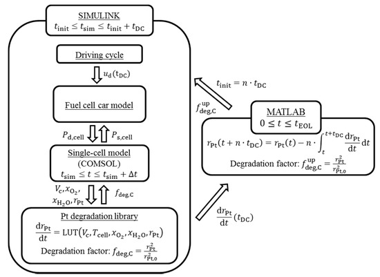 The simulation framework used in this study has been presented previously [25] and is only summarized here. Figure 1 shows the multiscale coupling of models where a two-way approach (bottom-up and top-down) is used to predict durability of fuel cells in an automobile application. In this methodology, the top-down direction starts from the system-generated transient load conditions for the fuel cell, which causes a transient variation in the state variables of the cell. The bottom-up direction starts from the degradation library (which is based on nanoscale studies). The generated degradation rates follow the transient changes in the fuel cell state variables and lead to a component-level performance loss of the fuel cell. The two-way approach leads to an active integration of the system model (fuel cell car) and component model (single cell) extended onto microscopic physicochemical processes governing degradation mechanisms. Firstly, the system model (Simulink) generates highly dynamic power demand () by matching the velocity requirement of the driving cycle () to the fuel cell power demand. The power is supplied by a fuel cell stack that is modeled by upscaling the single-cell generated power supply. The fuel cell model (COMSOL) interacts on the fly with the degradation library that provides instantaneous degradation factor () based on included degradation mechanisms through look-up tables (LUT), analytical functions or empirical mappings. The Simulink model simulates the time duration of a single driving cycle (). The total degradation over the driving cycle is calculated in MATLAB (2016a), which linearily upscales the degradation over one driving cycle to over ‘n’ driving cycles. This new state of degradation via the upscaled degradation factor () is set into the COMSOL model via Simulink. The entire framework is controlled in MATLAB that runs the durability loop until the cell end-of-life (). The details of the various components shown are discussed in the following sections.