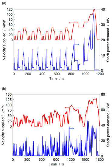The fuel cell car model is a modular representation of various components of a mid-size car that has an automotive driving cycle as an input and converts it into a cell-level power demand, as described in detail in our previous work [25]. Table 1 shows the car and stack parameters used in the current study. Figure 2 shows the velocity variation and corresponding predicted stack power demand from the driving cycles, NEDC and WLTC. Table 2 lists some basic characteristics of the two driving cycles.