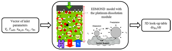 The Pt dissolution module is implemented in the EDMOND code [26]. EDMOND is a 1D double layer model. The model calculates the as well as the coverage of the various reaction intermediates, based on a dynamic coupling between the local operating conditions, that is, the cathode potential , the local temperature , the local water vapor fraction , the local oxygen fraction , the particle radius , and the kinetics of the intermediate reaction steps of Pt dissolution [37]. Both the surface potential and the coverage are involved in the mechanistic model. The Pt dissolution model used in this paper has been partially validated on 2000 h of durability tests [26]. With the help of EDMOND coupled with the Pt dissolution model, a look-up table was calculated, describing the evolution of the particle radius as a function of the local operating conditions (cf. Figure 4).