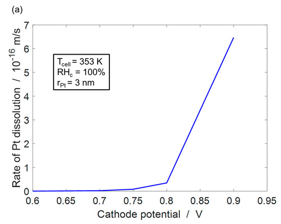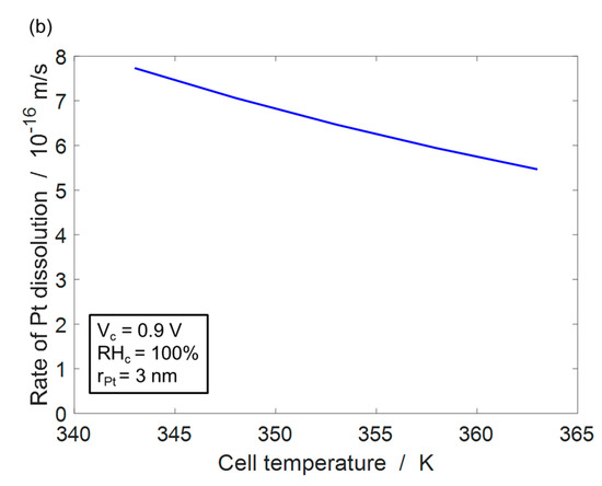 The physically based Pt dissolution model has been qualitatively validated with good agreement with the Pt dissolution sensitivities on local conditions (voltage, temperature, humidity, etc.) by Robin et al. [26]. Figure 5 shows the variation of the rate of Pt dissolution with cathode potential and for a Pt particle of radius 3 nm and keeping air humidity in cathode, at 100%. Figure 5a shows that the rate of Pt dissolution increases strongly for cathode potentials >0.8 V. This increase in the Pt dissolution rate for Vc > 0.8 V is in good agreement with experimental values presented by Ahluwalia et al. [4]. Figure 5b shows that the rate of Pt dissolution decreases with the temperature. Although, increasing the temperature enhances the reaction kinetics of Pt dissolution, but at a constant humidity it also increases the water vapor in the air. This leads to a reduction in the oxygen content in the catalyst layer. Consequently, the magnitude of equilibrium cathode voltage is reduced, which increases the overpotential, leading to a decrease in the rate of Pt degradation.