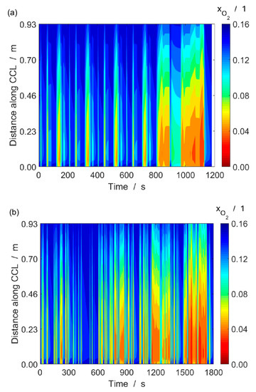 Figure 8 shows the temporal variations in mole fraction of oxygen along the cathode catalyst layer. It can be clearly observed that the time instants during the higher current densities (higher power demand) show more spatial variation in the cell state variables as compared to time instants with low current densities (low power demands). Moreover, the high mole fraction of oxygen at the air inlet () suggests maximum current density at the location and minimum current density at the air outlet (). This in turn suggests that the cathodic potential (cell voltage corrected by ohmic losses, cf. the following section) is higher at the air outlet as compared to the air inlet. Further, high power demand corresponding to car acceleration leads to a sharp decline in oxygen concentration (hence, sharp change in local pressure) over a larger part of the cell. Similarly, constant cruising at a high speed leads to a longer exposure of a large part of the cell to oxygen depletion. All these phenomena can be detrimental to the performance of various components, including the Pt catalyst, which will be quantified below.