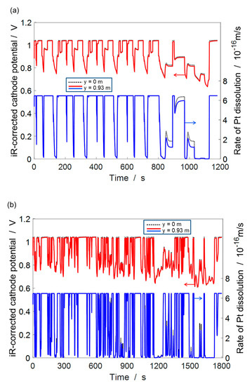 Figure 9 shows the iR-corrected cathode potential variation and the rate of Pt radius loss during the two driving cycles. The Pt dissolution rate is observed to be highest for near OCV operations. Further, in order to demonstrate the effect of spatial variation in the cell state variables on the rate of Pt radius loss, we show them at the two extremities in our cell geometry, namely, near the air outlet () and near the air inlet (). For persistent low cell voltages (high speed cruising), some difference in rate of Pt radius loss is observed at the air inlet and outlet. For the rest of the situations such as low speed cruising, acceleration and deceleration, we do not observe any noticeable spatial variation in the rate of Pt radius loss.