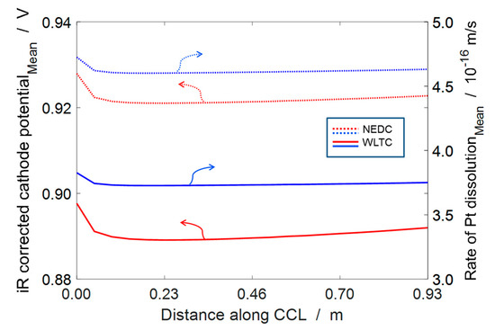 Figure 10 shows that the time-averaged (over one driving cycle) spatial distributions of iR-corrected cathode potential and rate of Pt dissolution for both driving cycles. One can observe small potential gradients near the air outlet over the duration of a driving cycle. This is due to significant changes in reactant concentration near the outlet over the highly fluctuating current demand during the driving cycle. Consequently, the rate of Pt dissolution also shows spatial gradients near the outlet. Further, one can also observe that the two driving cycles have different effects on the mean degradation rate at a given location. The NEDC with higher idling time leads to more near OCV operations as compared to the WLTC, and hence has a higher mean voltage and consequently, higher rate of Pt dissolution.