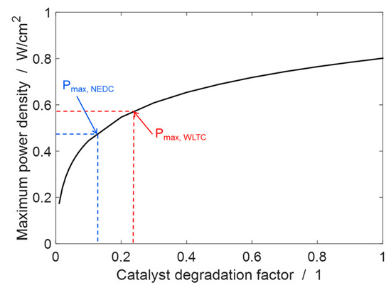 Maximum single cell power density at different values of catalyst degradation factor. The maximum single cell power density demand by WLTC and NEDC and corresponding minimum degradation factor is marked.
