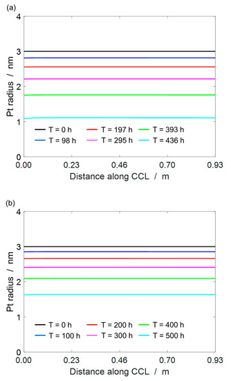 Figure 13 shows the distribution of Pt radius towards the end of life of the fuel cell. For the NEDC, the Pt radius at 436 h is 1.09 nm, which means that there is ~87% loss in Pt surface area after 872 NEDC loads (one NEDC is 1180 s). For WTLC, the Pt radius at 500 h is 1.63 nm, which means that there is ~70% loss in Pt surface area after 1000 WLTC loads (one WLTC is 1800 s). Figure 9a shows that during one NEDC, 19 cell voltage plateaus are occurring corresponding to a cell voltage of 1.04 V. We can compare these results to experimental data by Yang et al. [47], who use a square wave voltage profile between 0.4–1.05 V and observed an ECSA loss of ca. 60% during 10,000 cycles. The NEDC studied here could be, in a first-order abstraction, seen as a square wave voltage cycle behavior, where 19 square wave cycle equivalents between 0.62–1.04V are occurring during a single driving cycle. Hence, over 872 NEDCs, we can observe 16,568 square wave equivalent cell voltage cycles, which is in the same order of magnitude as the experiments by Yang et al. [47]. Considering the observation that smaller Pt particles dissolve faster, one could estimate greater degradation of Pt upon increasing the number of voltage cycles to 16,568 in the work by Yang. This demonstrates that the presented framework provides a comparable first-order estimate of cell durability under driving cycle loads.